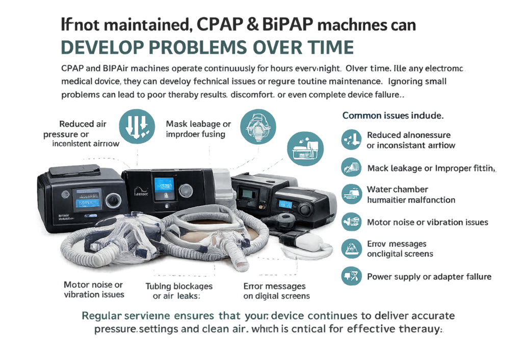 CPAP and BiPAP machines operate continuously for hours every night. Over time, like any electronic medical device, they can develop technical issues or require routine maintenance. Ignoring small problems can lead to poor therapy results, discomfort, or even complete device failure.