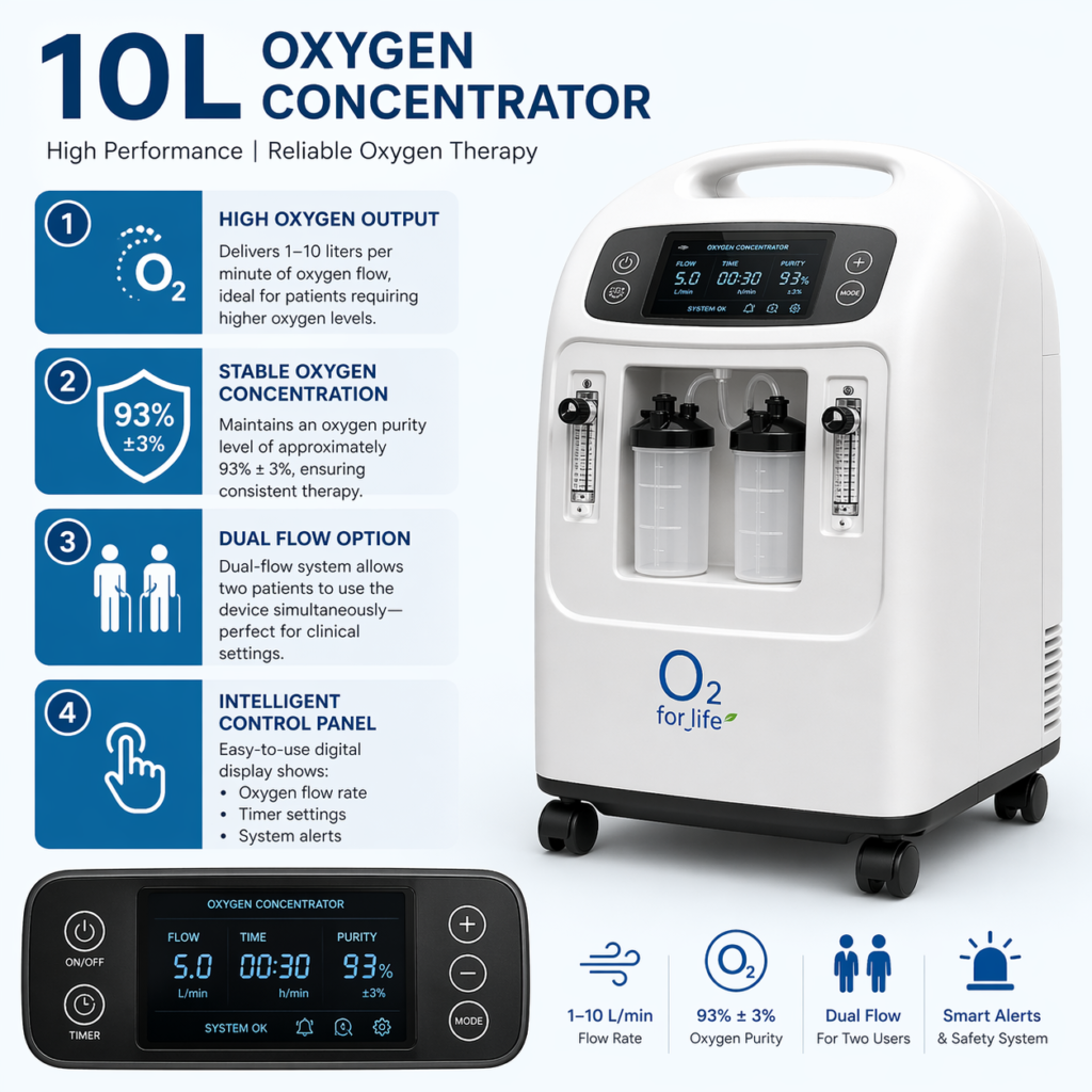 The Yuwel 10L Oxygen Concentrator is a high-capacity oxygen therapy device designed to deliver a continuous and stable flow of oxygen. Unlike smaller units, this machine can provide up to 10 liters per minute (LPM), making it ideal for patients with moderate to severe oxygen needs.